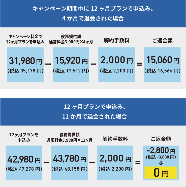 ※返金額は、6ヶ月プラン・12ヶ月プラン分としてお支払いいただいた金額から、役務提供額(月額通常料金×当月を含む利用月数)と解約手数料(2,200円[税込])を差し引いた金額となります。