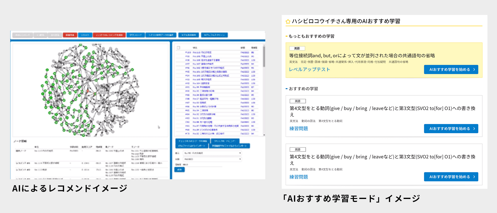 河合塾OneのAIは、高度な統計理論に基づいた理解度判定と機械学習によるレコメンドエンジンから構成されており、河合塾グループ独自開発のAIプラットフォームを活用しています。紙ベースのテストや一般的なe-Learningでは、問題の正解、不正解で理解度を判定していますが、河合塾Oneでは、ベイジアンネットワークという統計理論を基に、理解度を判定しています。学習者が問題を解く、解説を視聴するといった一つひとつの行動毎に、その学習の全トピック(「2次方程式」といった単位)の理解度をリアルタイムで算出し、理解度推定の精度を上げています。また、河合塾OneのAIでは、機械学習に基づいたレコメンドを行っており、理解度判定、学習履歴等のビッグデータ分析及びトピック間の因果関係を表すナレッジマップに基づいて、学習すべきトピックだけではなく、その中の教材(レベルチェックテスト、基本事項解説、練習問題、練習問題解説)から何を学ぶべきかを瞬時にレコメンドします。この結果、学習者一人ひとり異なる学習経路を辿ることとなり、オーダーメードのカリキュラムを提供することになります。河合塾OneのAIには、河合塾講師のノウハウを注入しています。つまり、レコメンドを行う土台となるナレッジマップの設定やレコメンドアルゴリズムの生成において、河合塾講師の知見が生かされており、このことは河合塾OneのAIが成長し続けるために不可欠であると同時に大きな強みとなっています。