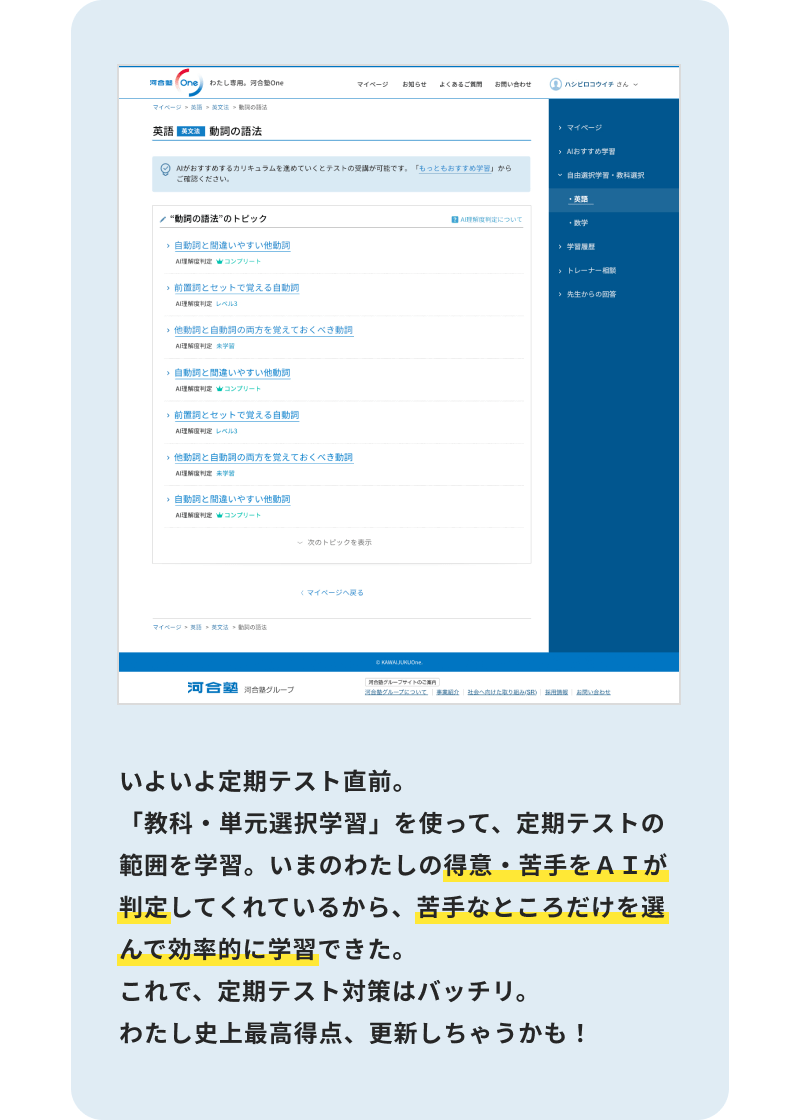 河合塾Oneでの学習や、先生への学習質問、トレーナーへの進路相談を使用した様子のイメージです。